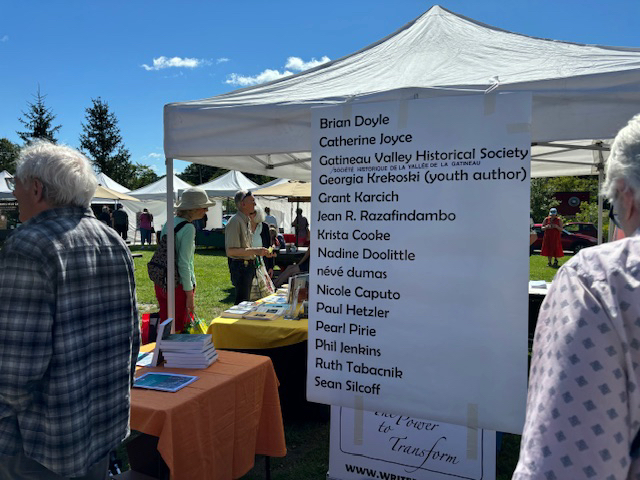 It was perfectly sunny and cool so it made for great amount of foot traffic. It was the usual suspects for authors with a few new additions. Brian Doyle, Catherine Joyce, Gatineau Valley Historical Society, Georgia Krekoski (youth author [new]), Grant Karcich, [new], Jean R. Razafindambo [new], Krista Cooke, Nadine Doolittle, névé dumas [who I did not chance to see, again.], Nicole Caputo [kids author], Paul Hetzler, Pearl Pirie, Phil Jenkins, Ruth Tabacnik [with the beads and things sewn for charity] and Sean Silcoff.