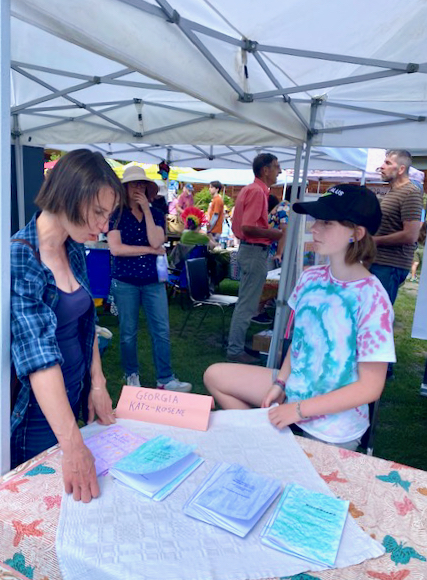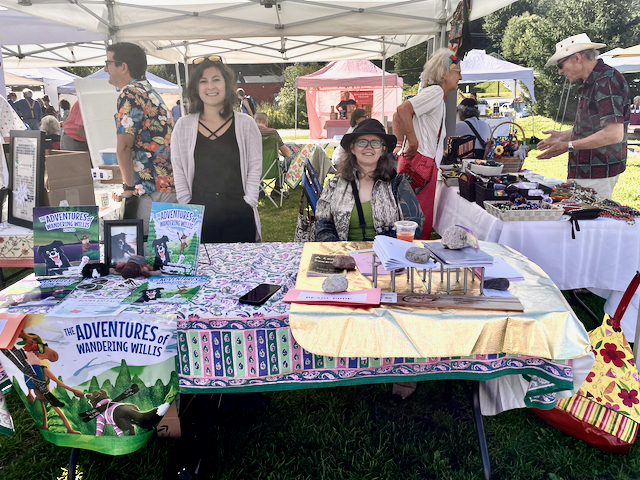 It was windy at day’s start so I gathered rocks to hold things down. As a young buyer commented, “I know it’s your books I am supposed to pay attention to, but your rocks are distracting.” I got a decent amount of sales, $75 or so, plus they gave us tickets for free drink or snack so that ups it to something like $85 for the morning.