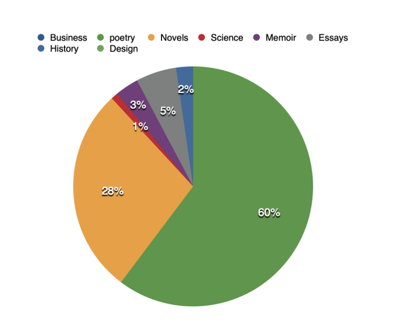I aimed to read more fiction proportionally this year, setting aside some obsession with poetry. Intention didn’t translate. 57% of titles were poetry, so all systems stable, with 1% more poetry than last year. A fifth of reads were chapbooks (56 of them). I read 20 fewer titles than 2022. This year I reread 15 instead of 24 titles.