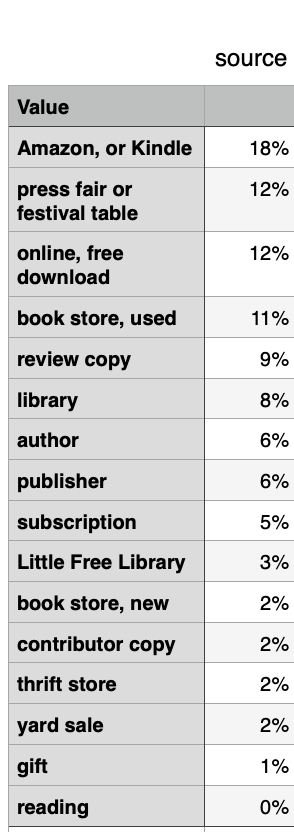 Source was a turnover this year with to spot being nearly a fifth from the Evil Empire of Amazon, compared to 8% Amazon in 2022 being beat out by the library, publisher, used book stores and review copies.