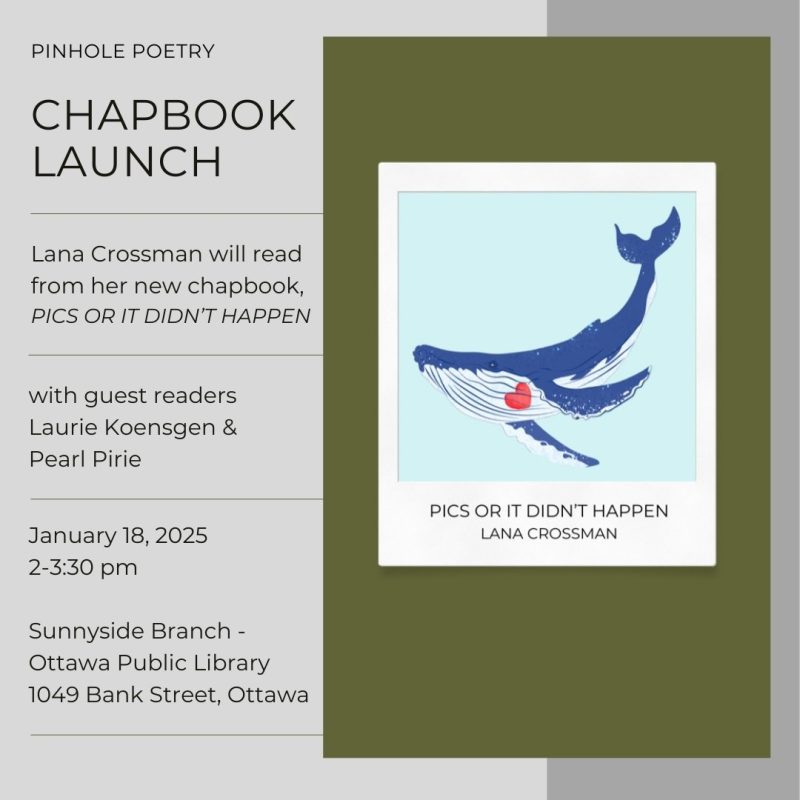 Sat., January 18, 2pm at the Sunnyside Branch of Ottawa Public Library. Her launch of Pics or It Didn’t Happen will be with guest readings by fellow Pinhole Press poets Laurie Koensgen and Pearl Pirie